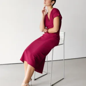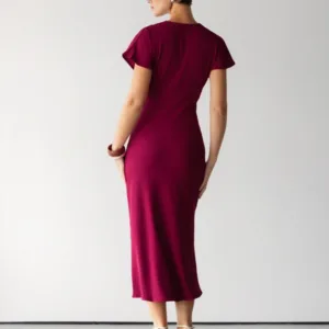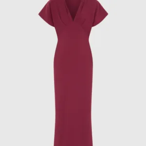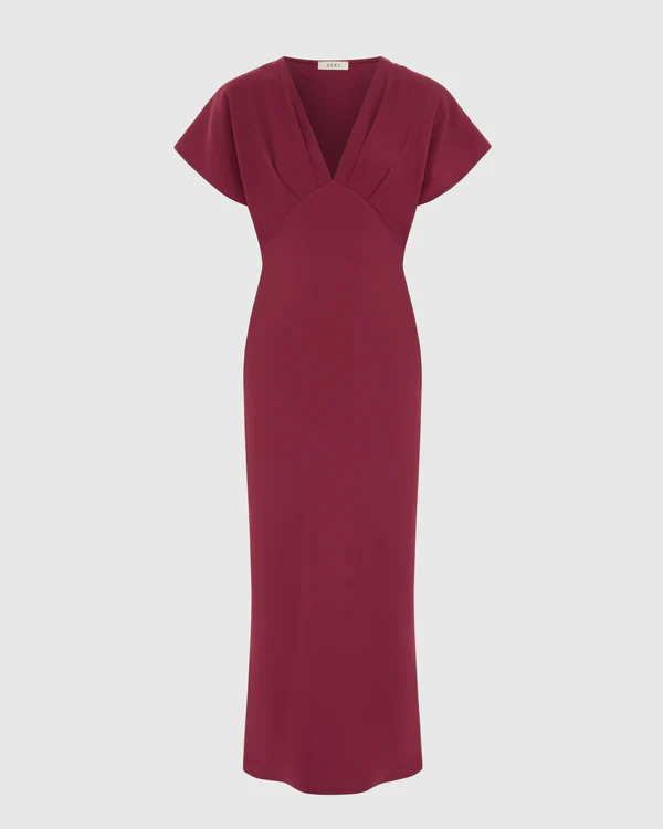 Designed with a ruched V-neckline and softly flared cap sleeves, this dress adds a touch of refined femininity to your wardrobe. The luxurious fabric skims your figure with the perfect balance of drape and structure.